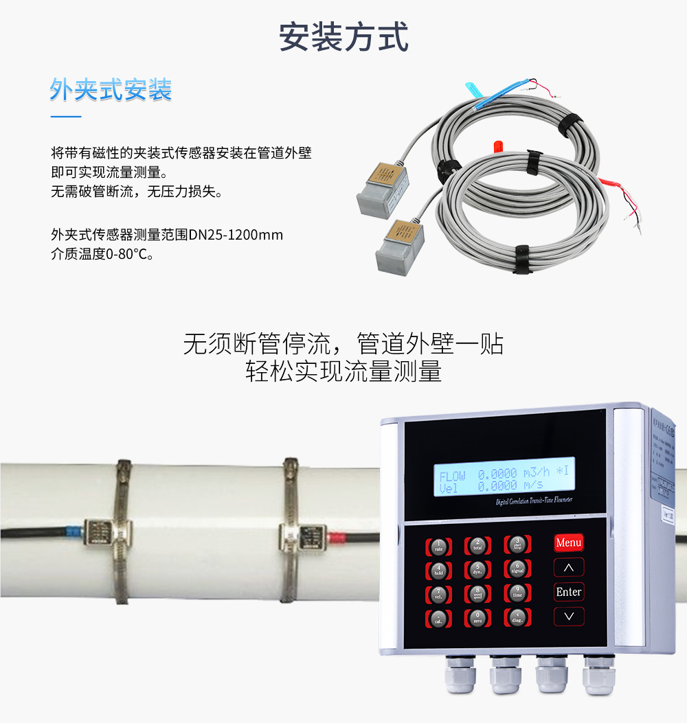 測超聲波流量計適合相對純凈液體流量的管外測量,尤其是在水流量測量、在工業循環水、空調制冷循環水、原水、高壓水、自來水,污水排放管等廣泛應用。